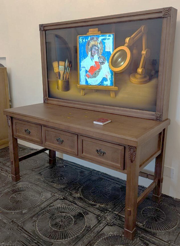 Интерактивный стол позволяет каждому посетителю лично «заглянуть» в реставрационную мастерскую. Созданием информационного стенда, который бы органично вписался в интерьер собора, не нарушая его атмосферу, но при этом предложил посетителям современный формат взаимодействия, занимались специалисты Kochubey Media. Взаимодействовать со столом просто и интуитивно понятно: печатные копии отреставрированных икон хранятся в ящике стола. Посетитель берет одну из них и кладет на специальную метку-считыватель на столешнице.