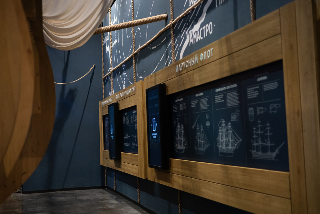С кораблями Черноморского флота посетителей знакомит инсталляция со слайд-скрином. Посетитель перемещает дисплей LUMIEN серии Basic как сканер вдоль статичных изображений парусников. Движение считывается датчиком положения, что запускает на дисплее анимацию о соответствующем корабле с размерами, водоизмещением, фактами истории.